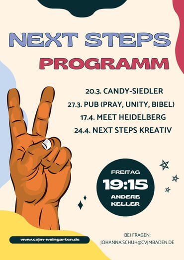 Was? Bei Next Steps erlebst du jeden Freitagabend zusammen mit anderen Jugendlichen abwechslungsreiches Programm – mal viel Action, dann ein entspanntes Quiz oder eine coole Aktion. Manchmal sind wir draußen in der Natur, an den meisten Tag in unserem gemütlichen Anderen Keller. Dabei leben wir Gemeinschaft, lachen zusammen und sprechen über Themen des Lebens und den Glauben.